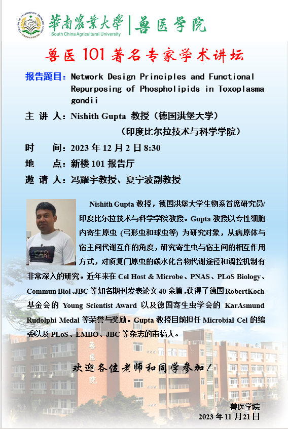 兽医101著名专家学术讲坛--Network Design Principles and Functional Repurposing of Phospholipids in Toxoplasma gondii