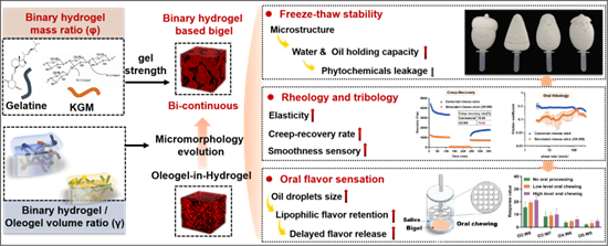 双凝胶是一种在特定温度和剪切速度下制备的均匀体系,它包含不同比例的油凝胶和水凝胶,能够共递送亲水性和疏水性活性物质。这一体系在食品工业中具有广阔的应用前景,特别是在提高口感质构控制和功能组分控制递送方面。研究团队采用蛋白质-多糖二元水凝胶作为研究切入点,通过调整二元水凝胶基质中魔芋胶与明胶的比例,成功实现了双凝胶结构演变的灵活调控。研究不仅关注双凝胶的储藏稳定性和冻融稳定性,还深入探讨了贮藏过程中风味保留的调控规律,为多糖构建环境响应型食品乳液(负载活性成分)的可行性和功效性提供了重要的理论参考和技术支持。此外,通过对双凝胶在模拟口腔咀嚼过程中的口腔风味感知进行评价,以及基于体外模拟胃肠道消化模型的研究,团队阐明了调控参数对双凝胶脂肪酸消化动力学、水/油溶性活性物释放和生物可及性的影响。