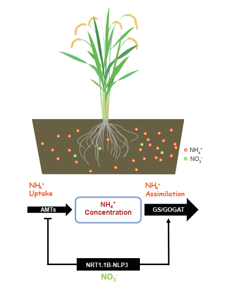水稻生活的土壤中铵盐(NH4+)浓度远大于硝酸盐(NO3-)浓度。NO3-通过NRT1.1B-NLP3信号传导途径抑制AMT1s表达降低铵盐吸收速率,同时促进GS/GOGAT的表达提高铵同化速率,进而降低植物体内NH4+积累,增强水稻的耐铵性。