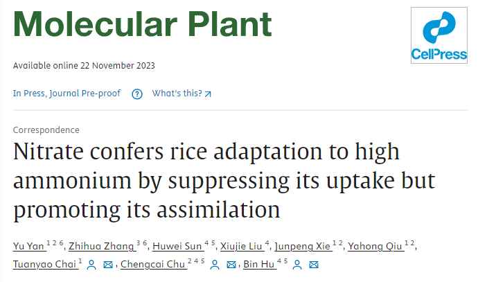 11月22日,华南农业大学农学院作物资源高效团队/中国科学院遗传与发育生物学研究所/中国科学院大学合作在Molecular Plant在线发表了题为Nitrate confers rice adaptation to high ammonium by suppressing its uptake but promoting its assimilation的研究论文(论文链接:https://doi.org/10.1016/j.molp.2023.11.008)。文章探究了水稻通过识别硝酸盐信号来调节铵的吸收和同化,进而适应稻田土壤高铵环境的分子机制。