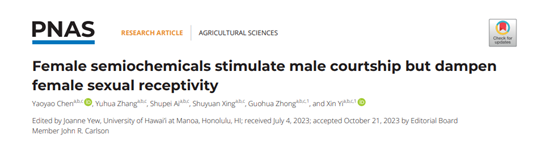 11月28日,华南农业大学钟国华教授和易欣副研究员团队在《美国国家科学院院刊》(PNAS)发表了题为Female semiochemicals stimulate male courtship but dampen female sexual receptivity的研究论文(论文链接:https://www.pnas.org/doi/10.1073/pnas.2311166120),阐明了雌性桔小实蝇性信息素通讯的“节俭策略”(semiochemical parsimony)新机制。