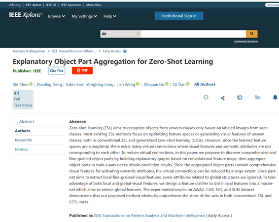 近日,我校电子工程学院(人工智能学院)国家精准农业航空施药技术国际联合研究中心兰玉彬教授团队在人工智能顶级期刊IEEE Transactions on Pattern Analysis and Machine Intelligence(TPAMI,中科院一区,影响因子24.31)在线发表了题为“Explanatory Object Part Aggregation for Zero-Shot Learning”的研究论文(论文链接:https://ieeexplore.ieee.org/document/10287616)。本论文提出一种零样本识别方法(ZSL),旨在识别未在训练样本中出现过的不可见类目标。
