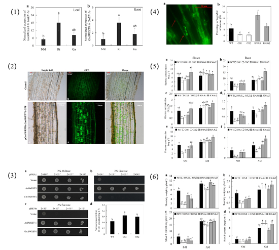 研究表明,接种合作型AM真菌显著增强GmSWEET6的表达;亚细胞定位分析发现GmSWEET6定位在丛枝周膜(peri-arbuscular membrane)上,酵母实验证实了其蔗糖转运功能。进一步通过大豆转化植株的研究发现,超量表达GmSWEET6会增加根系分泌物中蔗糖的含量,超量或干涉GmSWEET6表达会影响丛枝侵染结构的衰老进程。并且,过表达或干涉GmSWEET6均会影响大豆植株的生长、磷含量和糖浓度。以上研究证实GmSWEET6参与菌根共生中蔗糖向丛枝周腔(peri-arbuscular space)的外排。