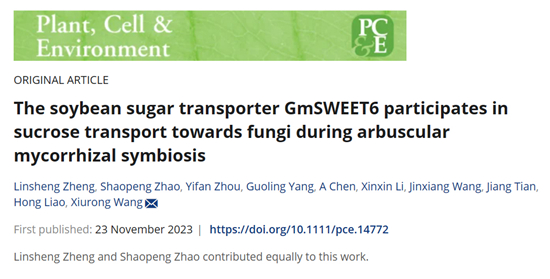 近日,华南农业大学资源环境学院根系生物学研究中心、亚热带农业生物资源保护与利用国家重点实验室王秀荣课题组在Plant, Cell & Environment发表了题为“The soybean sugar transporter GmSWEET6 participates in sucrose transport towards fungi during arbuscular mycorrhizal symbiosis”的研究论文(原文链接:https://onlinelibrary.wiley.com/doi/full/10.1111/pce.14772),发现了大豆中第一个参与菌根共生中蔗糖外排的转运蛋白GmSWEET6。