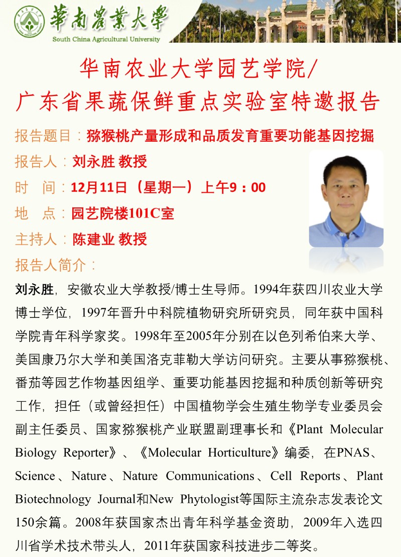 华南农业大学园艺学院/广东省果蔬保鲜重点实验室特邀报告:猕猴桃产量形成和品质发育重要功能基因挖掘
