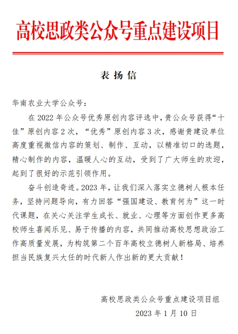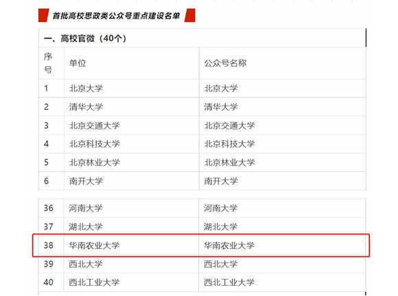 2021年,华农官微入选“全国首批高校思政类高校官微公众号重点建设名单”。该名单由中央宣传部、教育部等联合发布,全国仅40所、全省仅2所高校入选。自名单公布以来,高校思政类公众号重点建设项目组每月进行一次全国“十佳”和“优秀”原创内容评选(全国每月仅各评10篇)。截至目前,华农官微累计已有15篇作品获奖,2022年度获高校思政类公众号重点建设项目组表扬,学校融媒体工作室指导老师受邀在高校思政网直播分享公众号运营经验。
