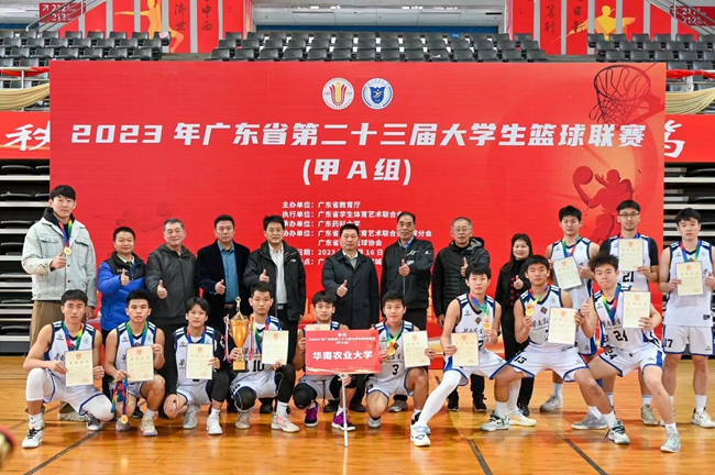 近日,由广东省教育厅主办的2023年广东省第二十三届大学生篮球联赛(男子甲A组)在广东药科大学体育馆成功举办。经过激烈角逐华农男篮以66:42的比分战胜深圳大学,成功卫冕冠军。