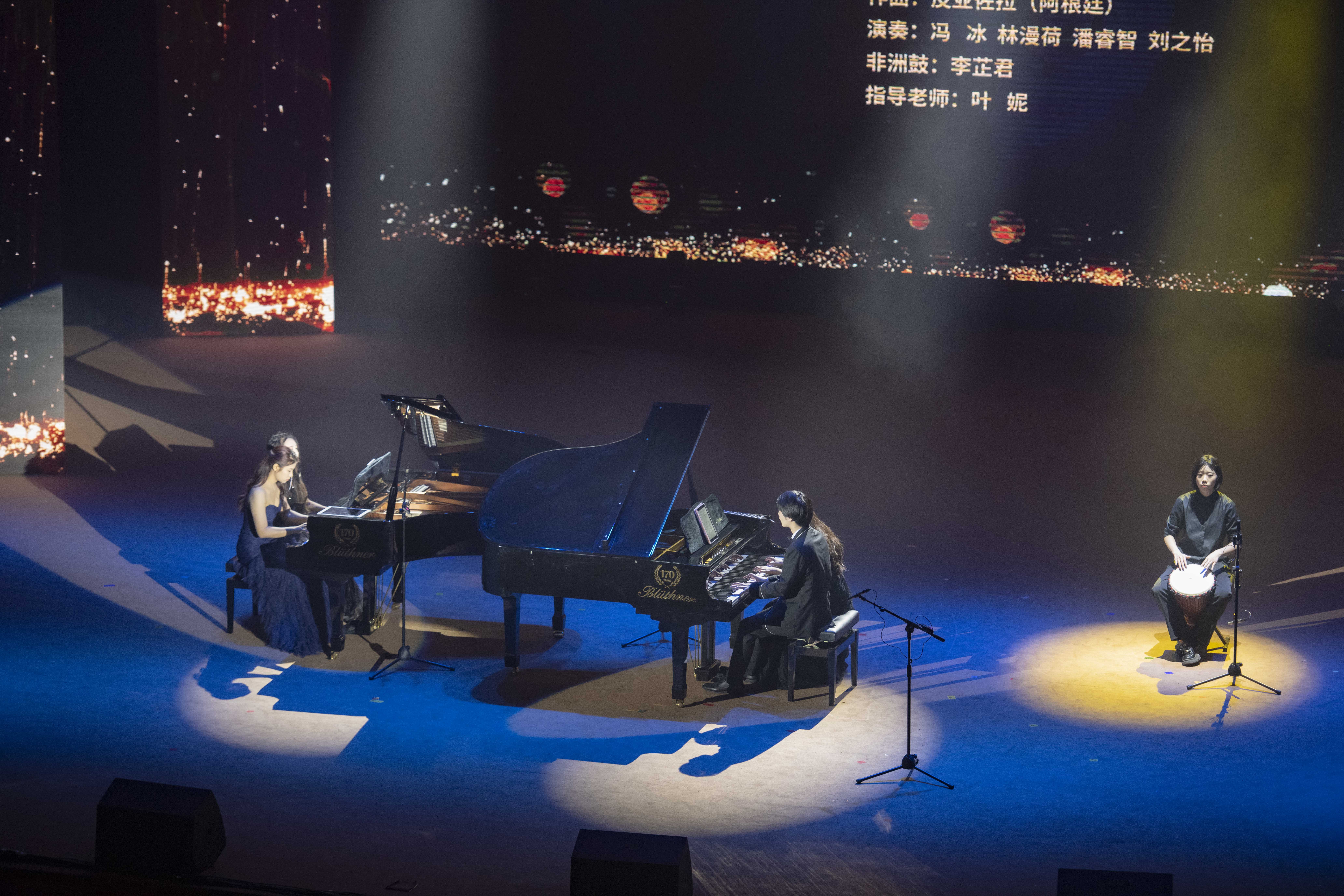 此外,音乐会上还有西洋乐器与中国传统乐器碰撞带来的火花。弦乐四重奏《G大调弦乐小夜曲》声势宏大,节奏鲜明热烈,展现了莫扎特的音乐才华和乐观主义精神。特邀嘉宾、青年小提琴演奏家、中山大学艺术学院管弦教研室主任原嫄与我校艺术学院音乐系教师朱虹带来的小提琴与钢琴协奏曲《梁山伯与祝英台》,再现了人民对自由美好生活的向往。钢琴八手联弹《对花》、《Libertango》在中国鼓、非洲鼓等乐器的配合下把现场观众带入了美妙的音乐殿堂,一曲结束,掌声不绝。