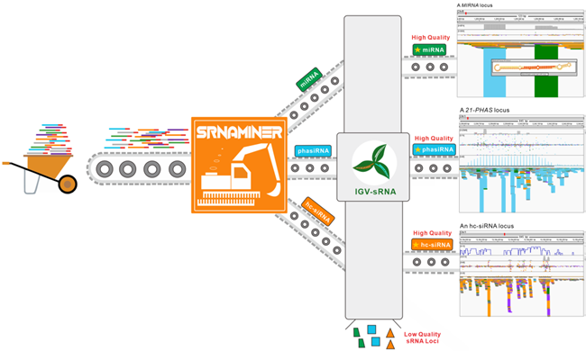 sRNAminer包含了常用的植物小RNA数据分析功能。其功能主要分为四大部分:(1)数据预处理,包括接头去除,数据去冗余,去除目标外的非编码RNA(rRNA、tRNA、snoRNA、snRNA)和质体污染以及读段回帖。(2)植物三种主要类型小RNA【微RNA(microRNAs,miRNAs)、相位siRNAs(phased small interfering RNAs, phasiRNAs)和异染色质siRNAs(heterochromatic siRNAs,hc-siRNAs)】的鉴定与表达量计算。(3)其他常用的功能包括:小RNA靶位点预测,介导PHAS位点产生的小RNA trigger预测,降解组测序数据分析等等。(4)小RNA位点可视化。sRNAminer的IGV-sRNA模块让用户能够针对相应类型的小RNA的特征对小RNA位点进行快速人工检查。