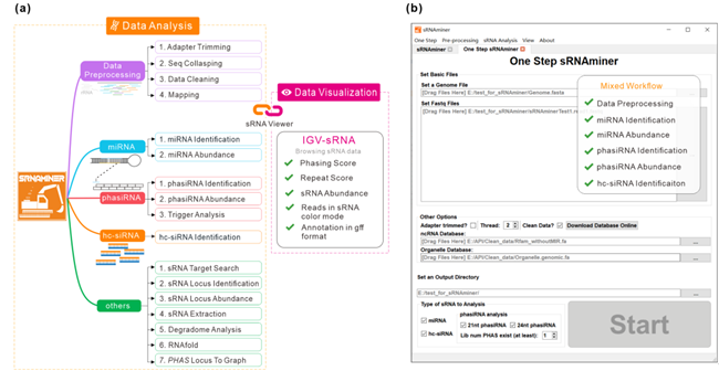 小RNA广泛存在于植物中,对植物的生长发育和营养繁殖起至关重要的作用。目前已有多款植物小RNA分析工具,但大多数依赖于命令行环境,无法有效支持湿实验室研究人员对植物小RNA生物功能的深度探索。同时,当前的小RNA分析工具多集中在单一类型的小RNA分析上,且计算资源消耗较大,通常还需花费大量时间和精力来学习众多工具或脚本的使用并组成可用的流程以获得最终分析结果。该研究开发的多功能植物小RNA分析工具——sRNAminer,可便于研究人员进行一站式小RNA分析及可视化。
