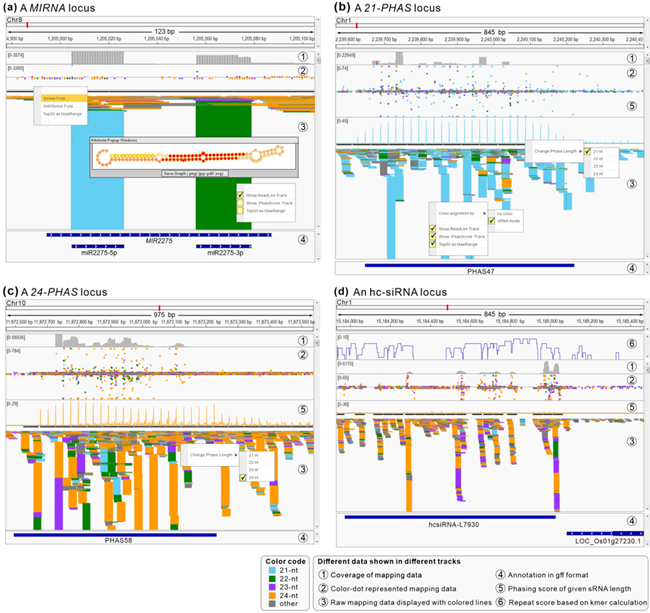为了实现对小RNA注释结果的高效人工检查,本研究基于基因组浏览器(IGV)开发了IGV-sRNA,并将其作为一个功能模块整合在sRNAminer里。IGV-sRNA可以呈现各种特异的小RNA特征,使研究人员能够更全面地理解小RNA数据。另外,用户配合sRNAminer的“sRNA Viewer”功能,即可快速跳转到对应的小RNA位点上,从而高效地查看小RNA位点。此外,sRNAminer支持高质量PHAS位点图批量自动绘制及RNA二级结构可视化。sRNAminer可以真正实现从分析数据到人工检查可视化结果再到高质量图表绘制的小RNA分析流程闭环。