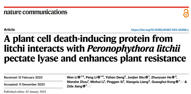 近日,我校植物保护学院荔枝病害研究团队在国际知名学术期刊Nature Communications在线发表了题为“A plant cell death-inducing protein from litchi interacts with Peronophythora litchi pectate lyase and enhances plant resistance”的研究论文。该研究报道了一个新的植物免疫正调控蛋白PlPeL1-interacting protein 1 (LcPIP1),其及同源蛋白与SERK3/BAK1直接互作,正向调控植物免疫。该研究为植物抗病育种提供了新的靶点和遗传资源。
