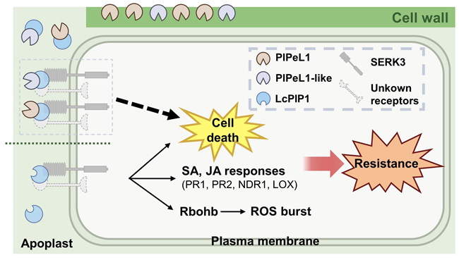 PlPeL1或PlPeL1-like和LcPIP1在植物免疫中的互作模式图