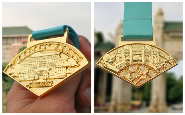 完赛奖牌的设计也是本次比赛的一大亮点。奖牌以祥云穿插画面,以学校行政楼、牌坊、教四钟楼、红满堂、牌坊、丁颖像等地标建筑为主体设计元素,并刻有选手冲刺姿态,寓意新的一年里有美好、团结、凝聚、力量的相伴。