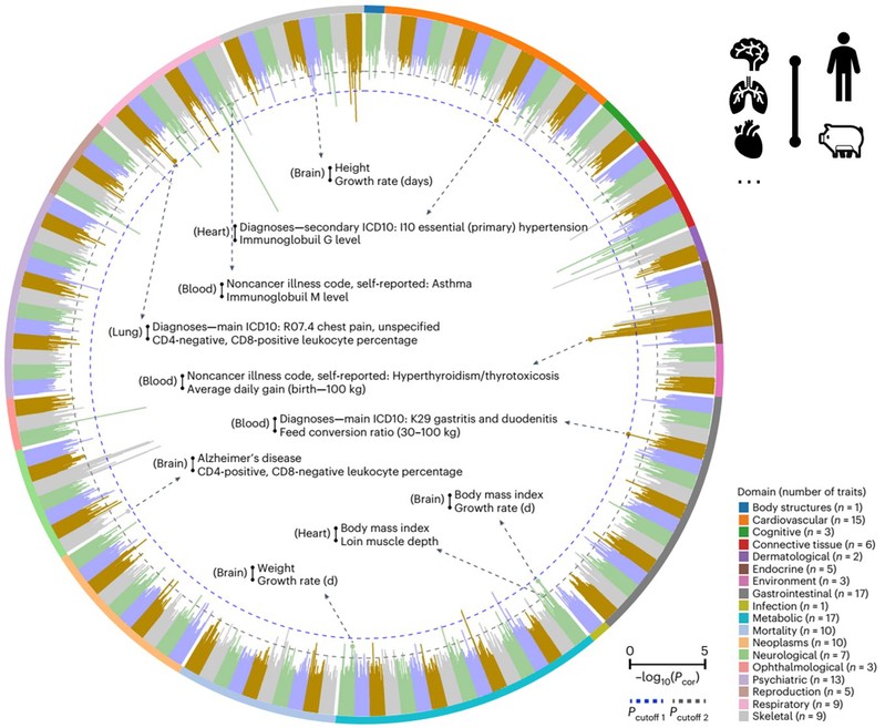为深入发掘猪作为生物医学模型的潜力,项目组通过遗传调控水平的物种间比较分析,揭示了猪和人类基因组当中共享的遗传调控效应。通过对36,448个人类-猪性状对在11个组织的全转录组关联分析结果比较分析,发现了89个显著相关的人类-猪性状组合,表明了猪和人类在复杂性状中具有相似的遗传调控效应。