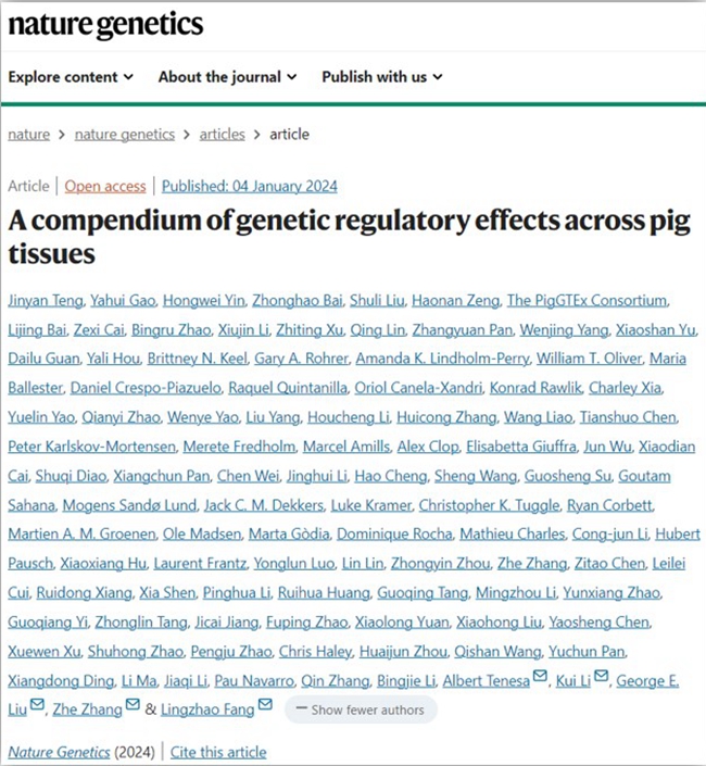 近日,猪禽种业全国重点实验室、国家生猪种业工程技术研究中心、广东省农业动物基因组学与分子育种重点实验室,华南农业大学动物科学学院张哲/李加琪教授团队与国内外多个团队合作在猪基因组学领域取得重要进展。由华南农业大学与丹麦奥胡斯大学、英国爱丁堡大学、美国农业部农业研究局(USDA-ARS)和中国农科院深圳基因组研究所等全球10个国家的50余个研究团队合作完成的PigGTEx项目研究论文“A compendium of genetic regulatory effects across pig tissues”(猪多组织遗传调控效应图谱)于2024年1月4日在线发表于国际顶级期刊《自然—遗传学》(Nature Genetics)。这是全球猪基因组学研究领域时隔8年再次登上《自然—遗传学》的研究成果,同时也是我国猪遗传育种领域第3篇发表于该刊物的论文。