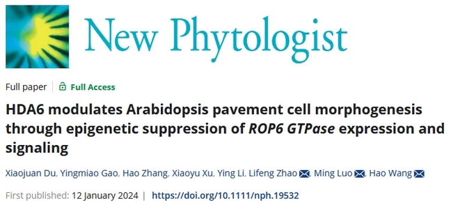 112日,华南农业大学生命科学学院王浩教授团队联合中国科学院华南植物园在《New Phytologist(2023IF:9.4) 在线发表了题为“HDA6 modulates Arabidopsis pavement cell morphogenesis through epigenetic suppression of ROP6 GTPase expression and signaling”的研究论文。该研究揭示了在拟南芥叶片表皮细胞的发育过程中,组蛋白去乙酰化酶HDA6表观调控小G蛋白ROP6介导的细胞骨架空间分布在叶表皮细胞极性建立与维系中的生物学功能和分子作用机制。