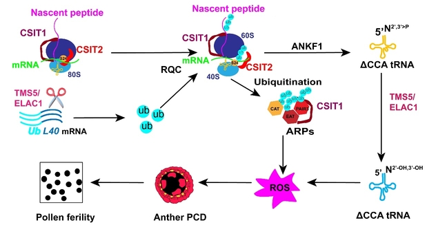 CSIT1和CSIT2参与水稻温敏不育系的不育起点温度调控,这些基因突变会导致不育起点温度上升,杂交制种时不育系容易自交结实而导致制种失败(即两系制种不安全性)。CSIT1和CSIT2均编码E3泛素连接酶,与TMS5一起参与核糖体关联的蛋白质质量控制。CSIT1主要参与翻译错误蛋白或未正确折叠多肽的泛素化,而CSIT2在蛋白质翻译出错时会泛素化核糖体蛋白使核糖体大小亚基解离。而核糖体解离后,参与翻译的tRNA也从核糖体解离下来,此时的tRNA的3'端存在缺陷,可能需要TMS5切去缺陷的3'端,重新加上CCA成为有活性的tRNA。