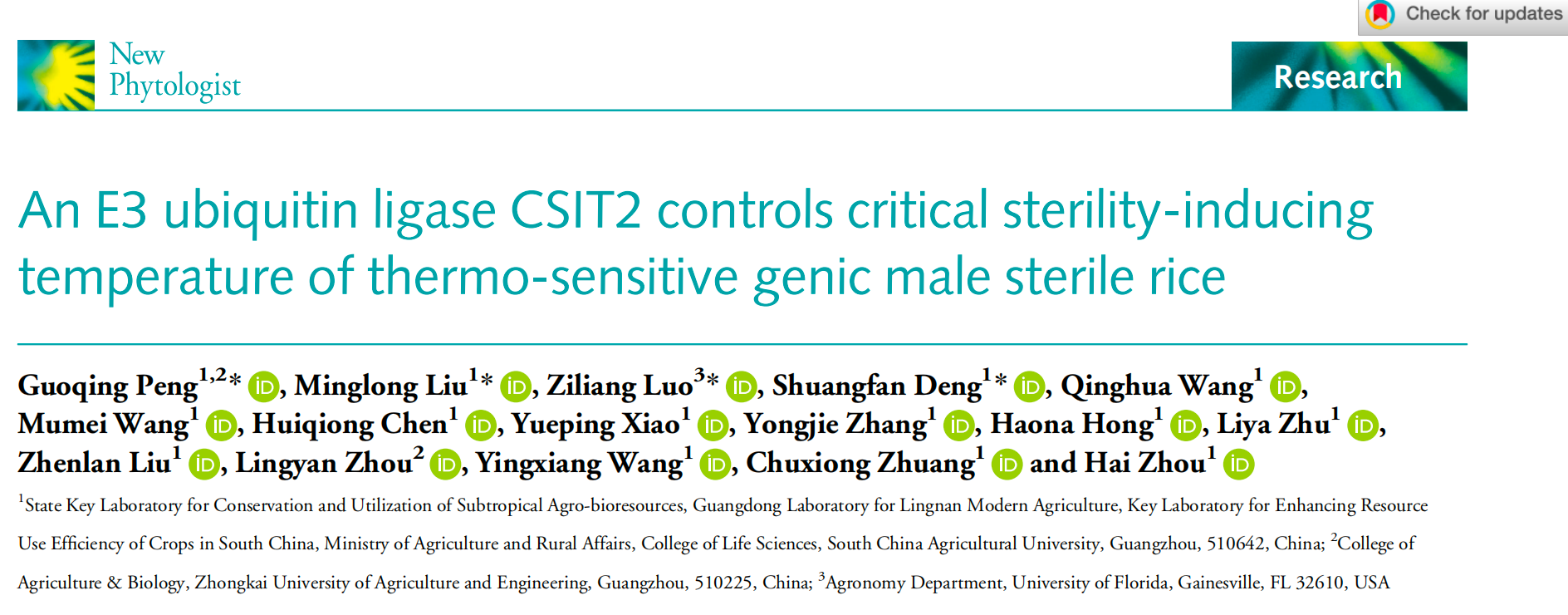 近日,生命科学学院周海课题组在New Phytologist上发表了题为“An E3 ubiquitin ligase CSIT2 controls critical sterility-inducing temperature of thermo-sensitive genic male sterile rice”的论文,阐释了新的不育起点温度基因CSIT2调控水稻温敏雄性不育的育性转变温度的分子机制。