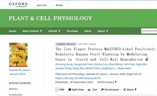 1月21日,华南农业大学园艺学院/广东省果蔬保鲜重点实验室朱孝扬/李雪萍课题组在Plant and Cell Physiology上以封面文章发表了题为The Zinc Finger Protein MaCCCH33-Like2 Positively Regulates Banana Fruit Ripening by Modulating Genes in Starch and Cell Wall Degradation的研究论文,该论文也被选为同期编辑推荐论文。该研究揭示了锌指转录因子MaCCCH33-Like2调控粉蕉果实成熟软化的分子机制,为研发特色蕉粉蕉果实的贮藏保鲜新技术提供理论依据。