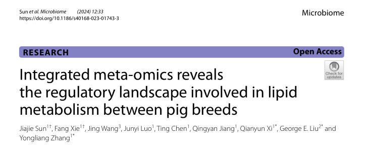 近日,我校动物科学学院、广东省动物营养调控重点实验室张永亮/习欠云教授团队联合美国农业部农业研究局(USDA-ARS)、河南省畜牧兽医研究所在国际知名期刊Microbiome(中科院一区,IF=15.5)在线发表了题目为“Integrated meta-omics revealsthe regulatory landscape involved in lipidmetabolism between pig breeds”的研究论文,揭示了不同猪品种间日粮脂类与肠道微生物互作、在肠段内的消化吸收与转运、在肝脏中代谢转化、在肌内沉积的差异。