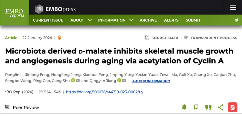 1月22日,我校动物科学学院江青艳教授和束刚教授课题组以猪禽种业全国重点实验室/广东省动物营养调控重点实验室为第一单位,在国际知名学术期刊EMBO Reports(影响因子:7.7)上发表了题为“Microbiota derived D-malate inhibits skeletal muscle growth and angiogenesis during aging via acetylation of Cyclin A”的封面研究论文,揭示了肠道菌群所产生的D-苹果酸在机体衰老过程中通过阻碍血管生成从而造成肌肉萎缩。