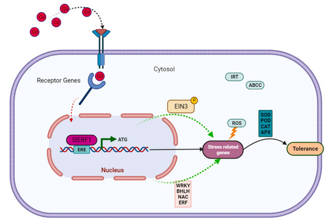 本研究分别对番茄植株进行Cd、nZVI和Cd-nZVI处理,发现与Cd处理相比,Cd-nZVI处理番茄植株的抗氧化能力显著提高,Cd含量显著降低。与对照(CK)相比,Cd-nZVI处理的番茄植株中乙烯响应因子SlERF1表达上调。蛋白互作预测分析发现,SlERF1与植物激素信号转导途径和胁迫相关蛋白互作(MED25、ETR1、CHl14、CHTB3、CHl9、EIN3-1、EIN3-2、EIN3-3和CTR1)。此外,与空载体对照相比,SlEFR1过表达酵母细胞在Cd胁迫下的生长速度更快,表现出更强的Cd胁迫耐受性。因此,nZVI通过激活SlERF1的表达来诱导番茄对Cd胁迫的抗性,从而改善植株生长和养分积累。本研究结果为进一步利用nZVI等纳米材料减缓植物Cd胁迫并促进生长发育奠定了理论基础。