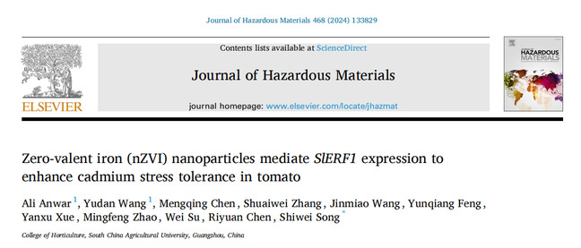 近日,我校园艺学院宋世威、陈日远教授课题组在环境科学与生态学领域国际著名期刊Journal of Hazardous Materials(中科院一区,影响因子13.6)上在线发表了题为“Zero-valent iron (nZVI) nanoparticles mediate SlERF1 expression to enhance cadmium stress tolerance in tomato”的论文,研究发现了提高番茄镉胁迫抗性的新机制。