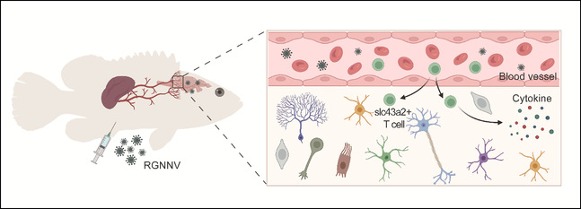 秦启伟教授团队长期围绕鱼类神经坏死病毒的感染致病机理、宿主抗病毒机制和防控技术进行研究,已经建立了石斑鱼中脑细胞图谱,发现了病毒感染中枢神经的靶细胞,发现了鱼类脑组织中存在T细胞等各类免疫细胞(Plos Pathogens, 2021)。本研究进一步分析鉴定了石斑鱼9个T细胞亚群,发现病毒感染石斑鱼脑组织后,脾脏和脑中Slc43a2+T细胞亚群显著扩张,利用脾脏缺陷斑马鱼模型和感染实验,脾脏缺失导致脑中缺乏Slc43a2+T细胞,提示脑中Slc43a2+T细胞来自于脾脏组织。对Slc43a2+T进行功能分析表明,Slc43a2+T细胞在脾脏内进行功能分化和成熟,然后迁移进入到大脑中发挥免疫效应。该研究揭示了病毒感染期间Slc43a2+T细胞从脾脏迁移到大脑产生免疫反应的新途径(图1),深入解析了鱼类中枢神经系统免疫细胞的来源及其作用方式,丰富了脊椎动物中枢神经抗病毒免疫的理论研究,同时可通过对Slc43a2+T细胞的功能开发提供RGNNV的防治新思路。
