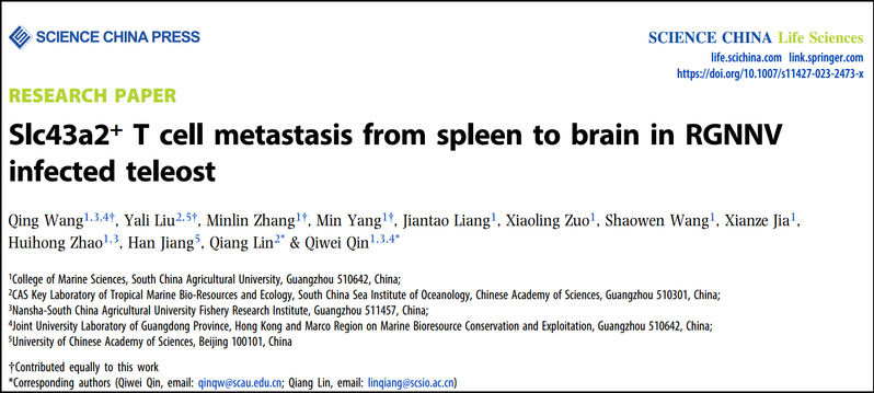 近日,我校海洋学院秦启伟教授团队联合中国科学院南海海洋研究所林强研究员课题组在中枢神经系统功能T细胞的来源方面取得重要研究进展,揭示病毒感染诱导鱼类脾脏中Slc43a2+T细胞转移进入脑组织的过程和功能特性。研究成果“Slc43a2+T cell metastasis from spleen to brain in RGNNV infected teleost”发表在国际知名期刊Science China Life Sciences(中科院一区,IF=9.1)。
