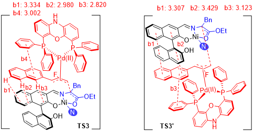 作者在控制实验的基础上,进一步通过理论计算揭示了反应产生对映选择性的机制。结果表明,在过渡态TS3中,Pd(II)-π-氟烯丙基物种和 Ni 配合物之间存在三个CH···π相互作用和一个π···π相互作用。然而,在TS3'中只形成了三个微弱的 π···π 相互作用(b1=3.307 Å、b2=3.429 Å、b3=3.123 Å)。 TS3 中这些非共价相互作用的距离比TS3' 中的短,这意味着TS3 中存在更强的非共价键相互作用。