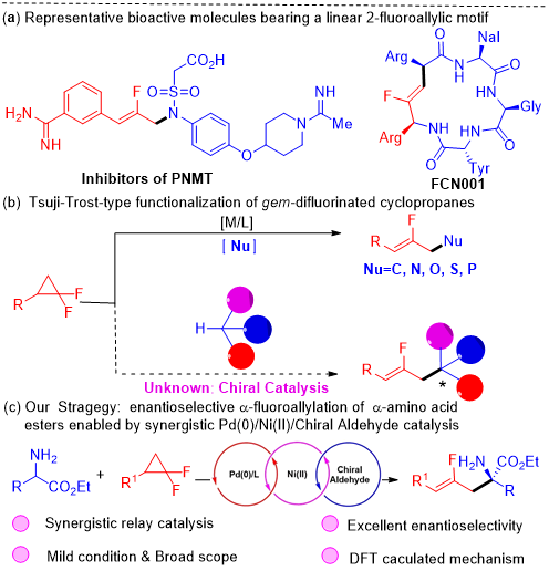氨基酸是组成生命起源的基本物质,非天然手性氨基酸的构筑是合成化学的热门研究领域,其中,氟代烯丙基取代的手性α-季碳氨基酸骨架具有极高的生物活性。但是由于缺少合适的氟代烯丙基前体,构建此类骨架具有极大挑战。近年来围绕“分子张力驱动的不对称催化转化”这一课题,材料与能源学院李兆栋课题组在前期对张力环烯烃去对称化研究的基础上(Angew. Chem. Int. Ed. 2024, 63, e202315092),继续深入挖掘,根据偕二氟环丙烷的高张力特性,提出利用过渡金属与有机小分子组成的三分子协同接力催化策略对偕二氟环丙烷进行不对称催化转化研究,联合汕头大学倪少飞副教授课题组和中科院上海药物化学研究所陈铁根研究员课题组开发了偕二氟环丙烷与氨基酸脂的不对称开环/脱氟偶联反应。