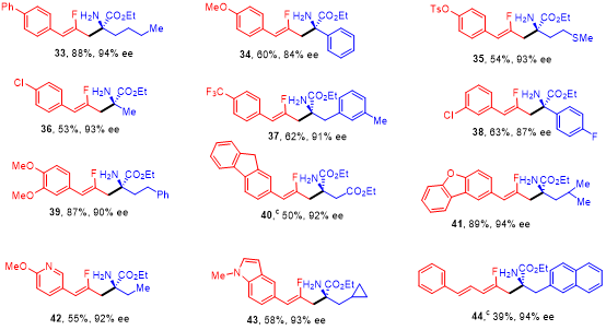该策略通过大位阻联萘二酚骨架的手性醛作为反应体系的提供手性环境,操作简单,对不同的氨基酸和偕二氟环丙烷都表现出广泛的底物适用性和官能团兼容性,为开发含有氟代烯丙基的高光学纯非天然氨基酸提供了可靠的技术路线。