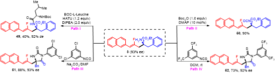 作者对所得到的高光学纯氟代烯丙基氨基酸酯进行了不同的衍生化反应。结果表明,氟烯丙基氨基酸酯不仅能进行脱水缩合形成多肽以及常用的合成砌块异氰酸酯,还能生成在农药分子常见的具有高生物活性的脲和硫脲片段。该衍生化实验进一步证实了所开发策略的合成价值,有望在新型活性分子的设计和开发中获得进一步运用。