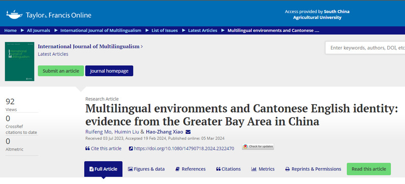 研究基于肖好章教授提出的生态交互语境模型理论,通过深入分析大湾区多语环境与粤语英语身份认同之间的关系,揭示语言与环境之间的紧密联系,为多语环境下的语言认同研究提供了新的视角和证据。相关成果发表在International Journal of Multilingualism,题目为“Multilingual environments and Cantonese English identity: evidence from the Greater Bay Area in China”。文章第一作者为我校外国语学院博士生莫瑞锋,第二作者为本科生刘慧敏,通讯作者为肖好章教授。