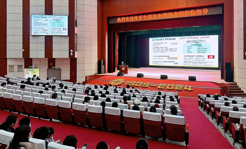 本科生院(招生办公室)负责人感谢各中学多年来为我校输送优质生源,并介绍了学校进入“双一流”以来在学科专业、人才培养和综合实力等方面取得的新成就,表示今后要进一步深化与生源高中的合作,相互走进,越走越近,在教育链、创新链、人才链“三位一体”融合发展中同题共答,共同跑好人才培养的接力赛,共绘立德树人的同心圆。本科生院(招生办公室)从校园美、实力强、特色靓、前途好等四个方面作学校2024年本科招生宣讲。