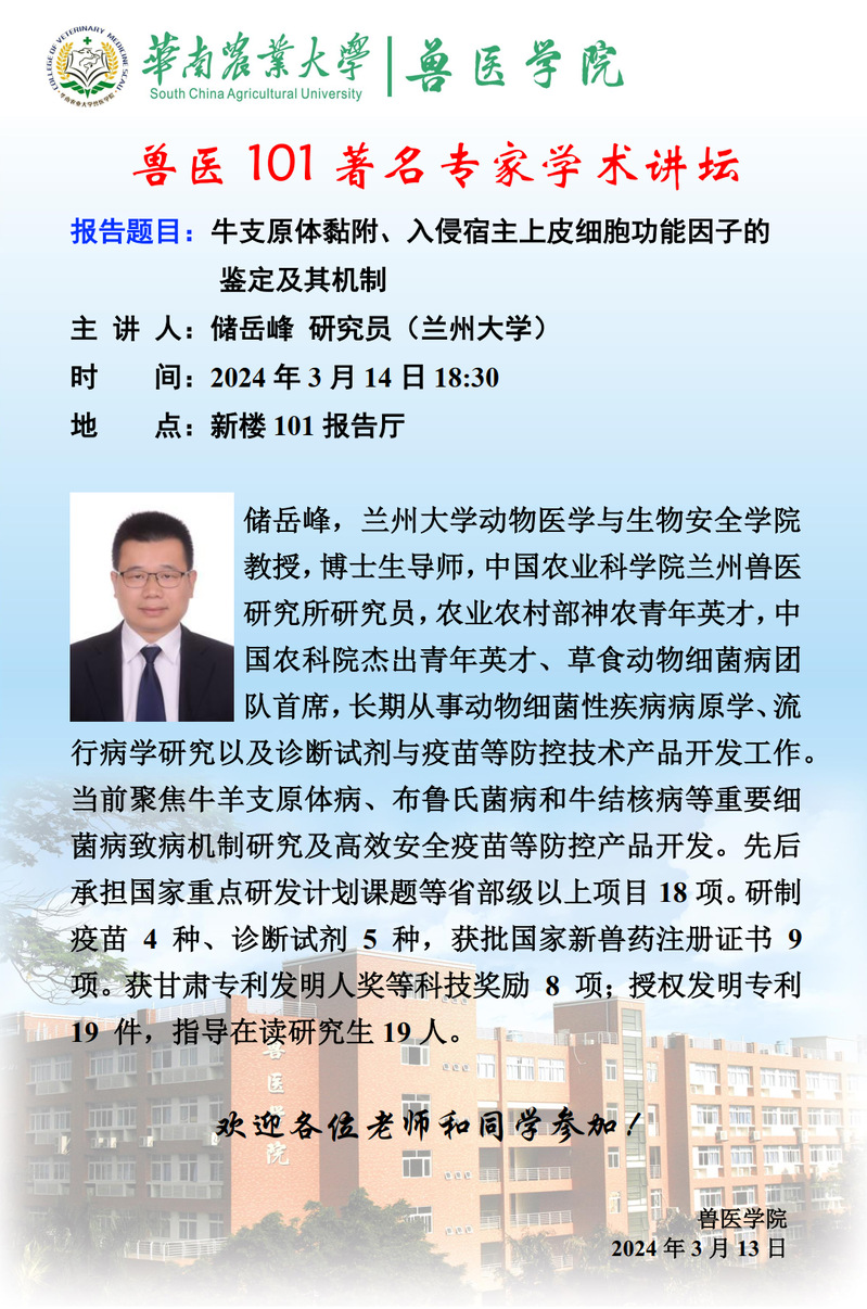 兽医101著名专家学术讲坛--牛支原体黏附、入侵宿主上皮细胞功能因子的鉴定及其机制