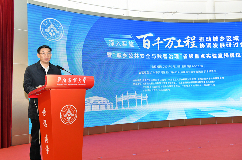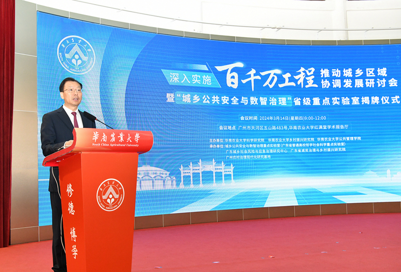 3月14日,我校在红满堂举行深入实施“百千万工程”推动城乡区域协调发展研讨会暨“城乡公共安全与数智治理”省级重点实验室(以下简称“实验室”)揭牌仪式。广东省社科联党组书记、主席张知干,校党委书记李凤亮出席活动并致辞。广东省社科联二级巡视员何方俊、