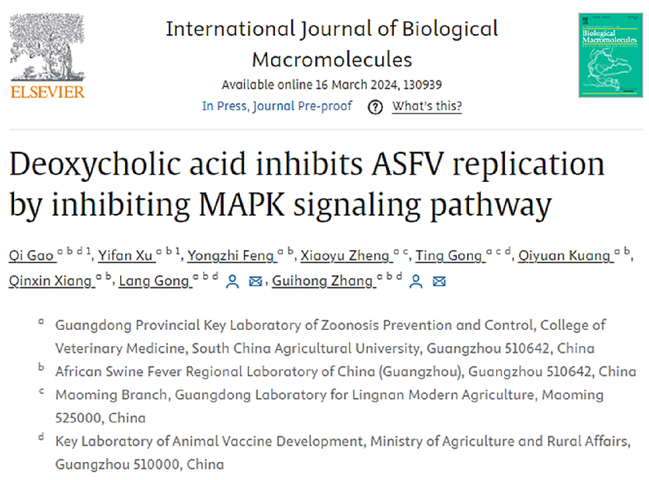 近日,我校兽医学院重大动物疫病防控团队张桂红/龚浪课题组在一区权威杂志International Journal of Biological Macromolecules在线发表题为“Deoxycholic acid inhibits ASFV replication by inhibiting MAPK signaling pathway”的文章,发现脱氧胆酸(Deoxycholic acid, DCA)通过下调MAPK信号通路抑制非洲猪瘟病毒(African Swine Fever Virus, ASFV)复制。