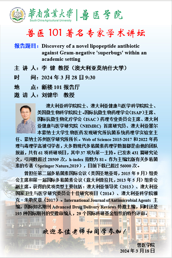 兽医101著名专家学术讲坛--Discovery of a novel lipopeptide antibioticagainst Gram-negative 'superbugs' within anacademic setting