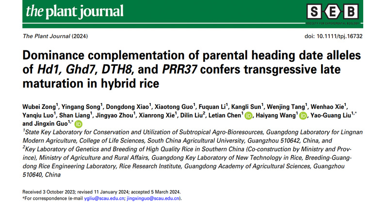 3月26日,我校亚热带农业生物资源保护与利用国家重点实验室、生命科学学院刘耀光院士团队,郭晶心研究员课题组在Plant Journal发表了题为Dominance complementation of parental heading date alleles of Hd1, Ghd7, DTH8, and PRR37 confers transgressive late maturation in hybrid rice的研究论文。论文揭示了杂交稻超亲晚熟的主要遗传基础是聚合了来自双亲的功能型抽穗期核心基因Hd1、Ghd7、DTH8和PRR37,同时建立了分子标记辅助系统以鉴定亲本这四个基因的功能类型,根据具体的育种目标,在配组之前即可预测杂交稻的感光特性。
