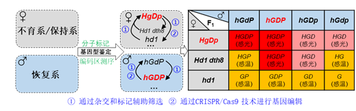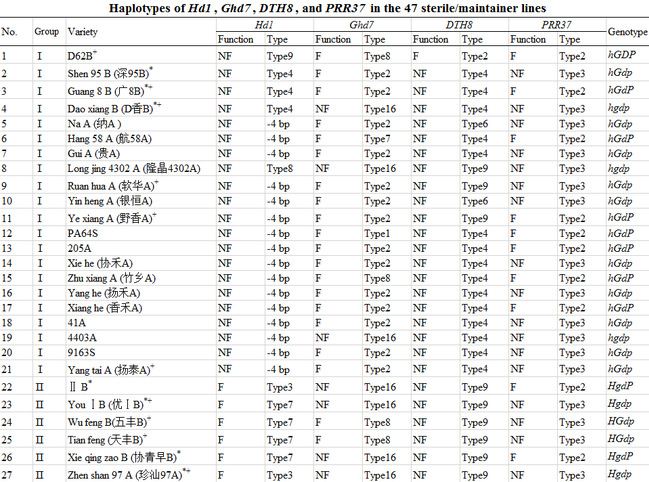 在农业生产中,育种家依据耕作制度和水稻品种的抽穗期定义感光性和感温性。感光品种是指在早季(长日)抽穗很晚或不抽穗,但在晚季(短日)抽穗正常(例如在华南稻作区,在6月中旬仍不能抽穗的为感光品种)。不感光的品种统称为感温品种,可在长短日照条件种植(如在华南稻作区,感温品种的抽穗期在6月,成熟期为7月初,不影响晚季种植)。利用论文提供的系列分子标记并结合基因编码区测序,可以快速鉴定亲本这4个基因的单倍型是否有功能,在杂交前即可预测杂交稻的感光特性。此外通过杂交导入和标记辅助选择,或利用CRISPR/Cas9技术,可以改变亲本的基因型,定向培育特定感光性的杂交稻。Hd1 DTH8型不育系(HgDp)和Ghd7 DTH8 PRR37型恢复系(hGDP)为互作感光性亲本,以这种基因型亲本进行组配极大概率产生超亲晚熟的杂交稻。