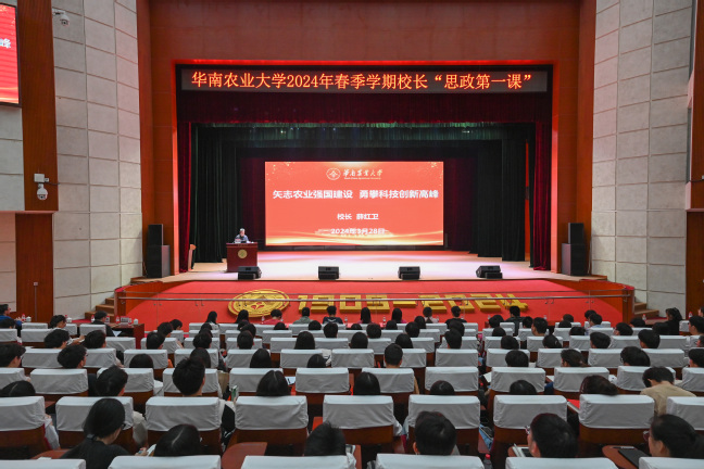 3月28日下午,华南农业大学校长薛红卫教授以《矢志农业强国建设 勇攀科技创新高峰》为题在丁颖礼堂讲授“思政第一课”。学校本科生、研究生代表,各学院党委副书记、辅导员代表等共计550余人现场听讲。