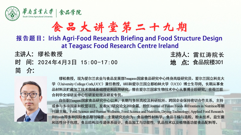 食品大讲堂第二十九期:Irish Agri-Food Research Briefing and Food Structure Design at Teagasc Food Research Centre Ireland