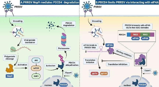 本研究发现PDCD4是一个之前未被识别的PRRSV宿主限制因子,并揭示了PRRSV拮抗PDCD4的对策。这将为阐明病毒-宿主之间的相互作用和开发新的抗病毒靶点提供新的见解。