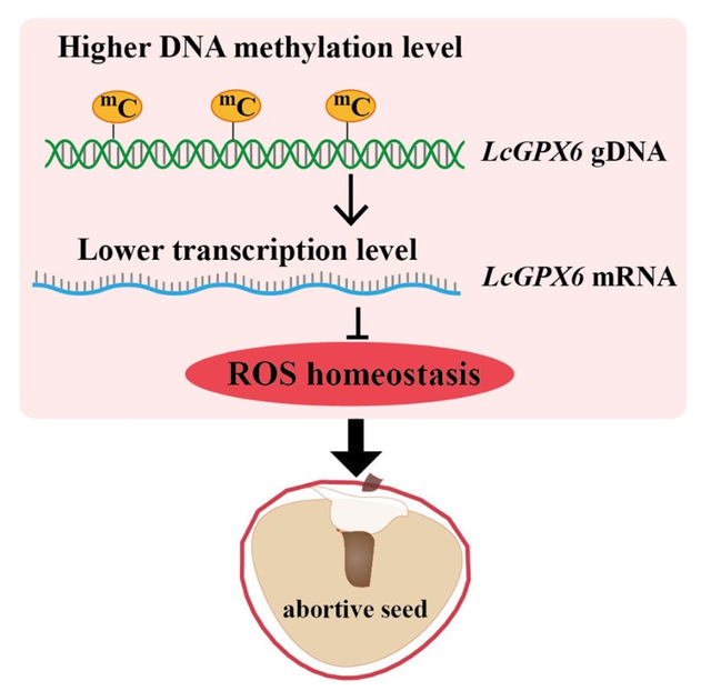 该论文发现‘怀枝’种子早期发育阶段的DNA甲基化水平显著高于在‘糯米糍’种子早期发育阶段;两个品种种子中DNA甲基化介导的差异基因可富集到ROS代谢途径,并挖掘到编码清除ROS的关键基因LcGPX6在‘糯米糍’种子中具有更高的DNA甲基化水平,其表达量显著低于在‘怀枝’种子中的表达水平。活性氧定性和定量分析,进一步证实了‘糯米糍’种子比‘怀枝’种子积累更多的ROS。通过分析,确证了LcGPX6具有清除ROS和调控种子发育的功能。该论文揭示了DNA甲基化介导的ROS稳态在荔枝种子发育调控中的重要功能。高水平的DNA甲基化可能通过抑制LcGPX6等基因的转录,促进了种子中ROS的积累,打破了ROS稳态,进而导致了焦核种子的形成。