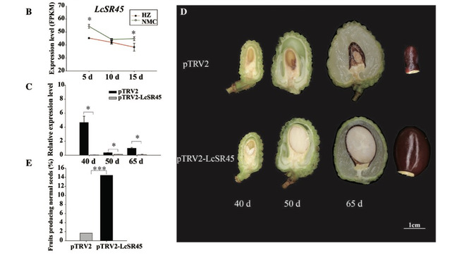 图2. VIGS介导RNA剪接因子LcSR45的沉默促进大核种子的形成