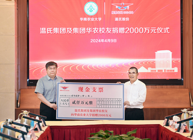 为庆祝华农115周年校庆,温氏集团及集团华农校友向学校捐赠了2000万元。温志芬作为捐赠代表向学校捐赠现金支票,薛红卫向温志芬颁发了捐赠证书及纪念牌匾。
