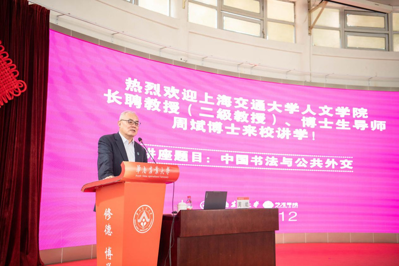 4月12日下午,我校邀请上海交通大学周斌教授在红满堂为师生做“中国书法与公共外交”专题讲座。本次讲座是我校115周年校庆“文化华农”系列活动之一。暨南大学校董、华南农业大学客座教授梁仲景出席讲座。讲座开始前,学校党委书记李凤亮在酸奶文化馆接待了周斌、梁仲景一行,周斌教授现场挥毫赠送“上善若水”书法作品。副校长蒋育燕出席讲座并致词。