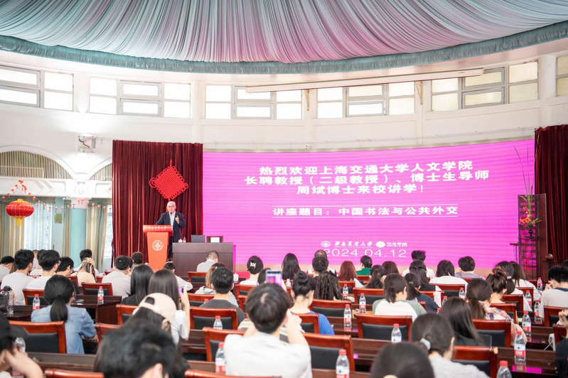 讲座上,周斌教授从书法的文化传播意义讲起,以自身经历为引,从“书法搭建中华文化与世界交流的桥梁”“世界不同种族与趋同的审美心理”“推进世界文明互鉴,共筑美好未来”三个方面,讲述其多年来从事书法研究与实践的情况,分享了其作为时任联合国秘书长潘基文先生的书法教师,以中国书法为媒介传播中华优秀传统文化等经历,在场师生深刻感受到了书法在国际舞台上的独特魅力。